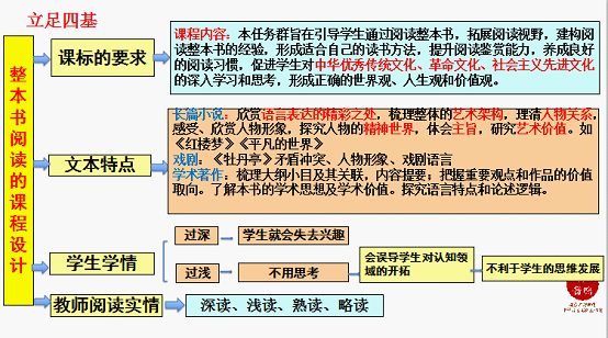 蒋老师说,从教师“深”读、学生“真读”、任务驱动“促”读、课上课下“联”读四个方面推进整本书阅读的进程。“四读”联通,整体谋划,精心安排,持续推进,才能产生实效,实现整本书阅读与研讨的课程目标。