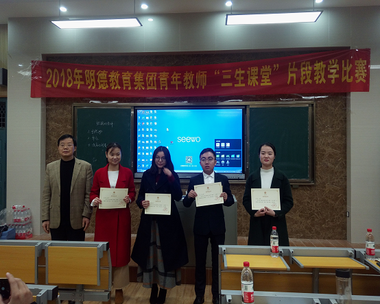 刘林祥校长为2018年明德教育集团青年教师“三生课堂”片段教学比赛四位一等奖获得者颁奖,右二为黄志海老师