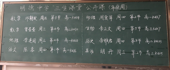 本学期,明德中学继承优良传统,推出了“三生课堂”公开课听课评课系列活动,各学科每周安排至少一堂公开课,教务处在微信群和乐诚堂一楼黑板统一发布预告,学校行政领导深入一线听课,公开课带动常规课,并成为了各学科组教研活动的重要抓手,既提升了课堂教学质量、提高了教研实效,又促进了教师专业发展。