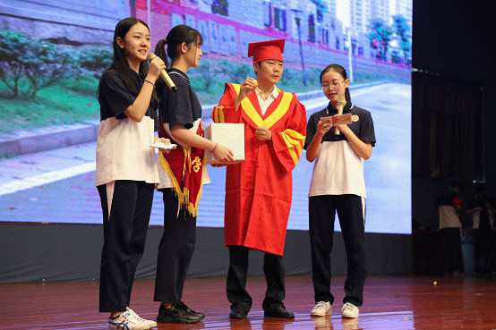 明德中学今年的毕业典礼依旧延续往年的传统:精美的“档案存储盒”(每位毕业生留存一份最有意义、最有价值的个人资料)由副校长郭陆初、纪委书记周喜兰亲自贴上“印记青春、相约未来”的封条并盖章留存;明德是“院士摇篮”,为表达对明德学子的期待与祝福,典礼上举行 “未来院士”抽选活动,由党委书记徐林抽选 “院士”,校长刘林祥、副校长伍卓林颁发“未来院士”证书及毕业证书;齐唱明德校歌,愿勿忘“坚、苦、真、诚”校训,期未来“相与修齐治平”。