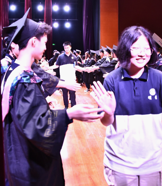 随后,高二毕业生和即将进入高二的学子上台进行击掌仪式。通过击掌的仪式,毕业生们把坚苦真诚的精神传递给即将进入高二的下一届学弟学妹们,也希望这种精神能作为国际部的一种传统,激励每一届师生走向更高更远的舞台。
