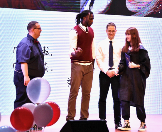 接下来迎来了最重要的环节——颁发结业证书。高二毕业生一一上台,从班主任手里接过凝聚了自己2年汗水和努力的结业证书,和外教们合影道别。这也意味着他们即将踏上异国他乡独立生活的旅程了。