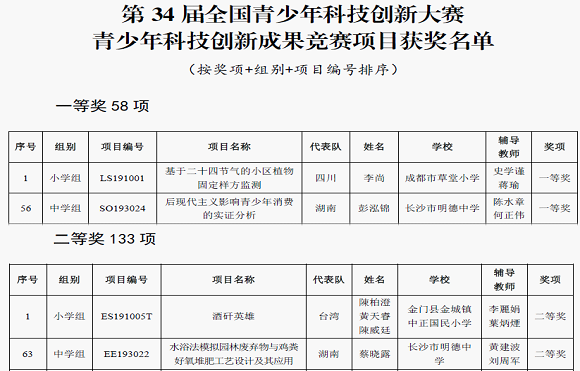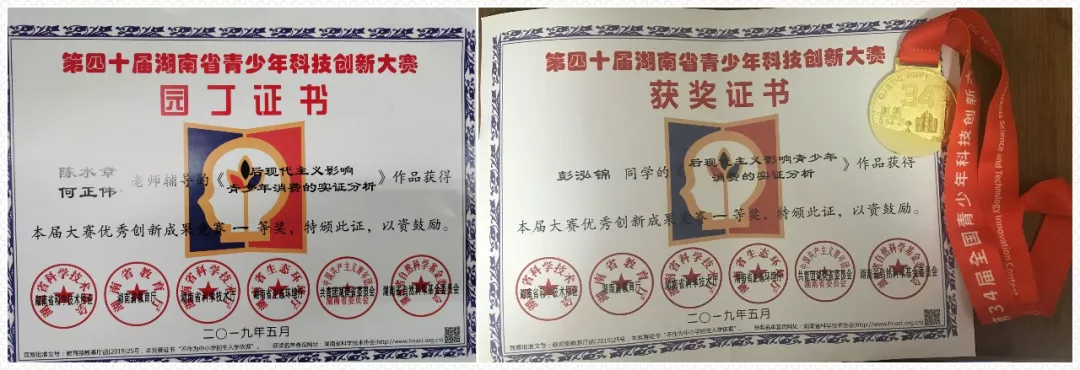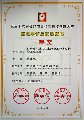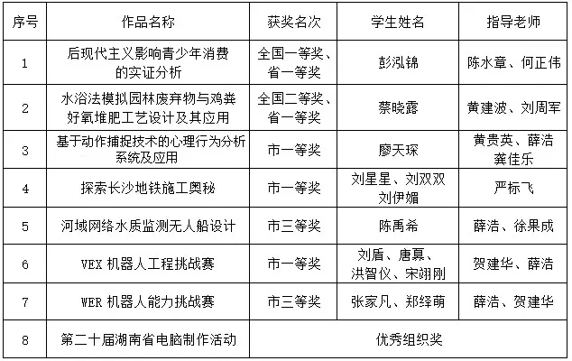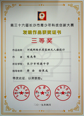 2019年青少年科技创新大赛及电脑制作比赛,由全国青少年科技创新大赛组委会、湖南省电化教育馆、长沙市科学技术协会、长沙市教育局、长沙市科学技术局等单位共同组织,在本次比赛中,我校师生充分发扬了明德人“坚苦真诚”的校训,顽强拼搏,不懈奋斗,取得了可喜成绩,特向全校师生及家长报喜。具体获奖情况如下: