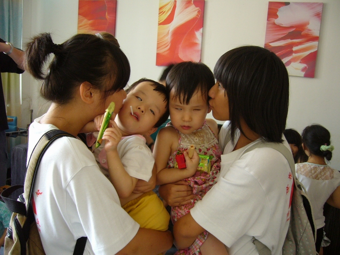 上图为陈晓宇(右一)和同学向欣玥拥抱亲吻一对被遗弃的残障孤儿双胞胎。