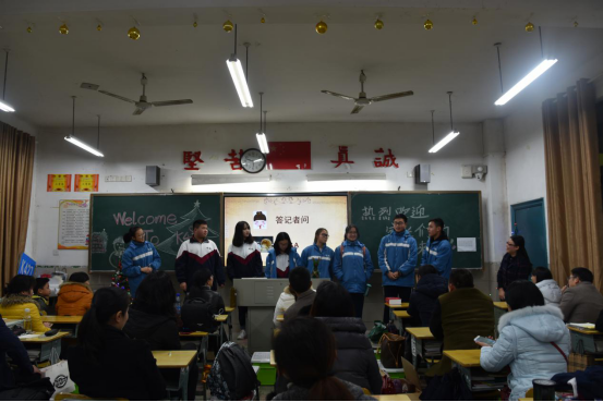 班主任蒋老师正在向家长们介绍会议的流程。本次家长会与以往的不同的是由学生来主持家长会,两位主持人的台词还有中英文的对照,也新增加了一个环节:“答记者问”就是由学生们来回答家长们所提出的疑问。