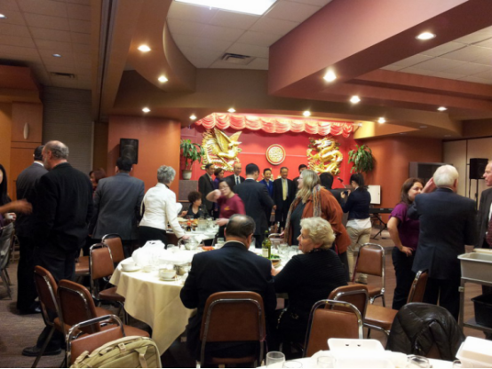 省督李绍麟先生因为公事,晚到了一会。当省督来到宴会大厅,大家迎接他时,我被震惊了。所有人起立向省督致敬,奏响加拿大国歌,在一旁的我很装模作样地和大家一起在鼓掌欢迎省督的到来。