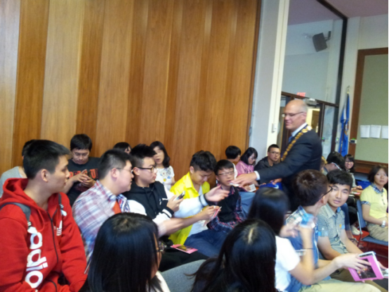 福廷市长还给每位学生赠送了纪念品。和市长愉快的交流后,同学们很高兴能成为中加友谊城市的友好使者,更感到自己在加拿大的使命已不同于一般的留学生。