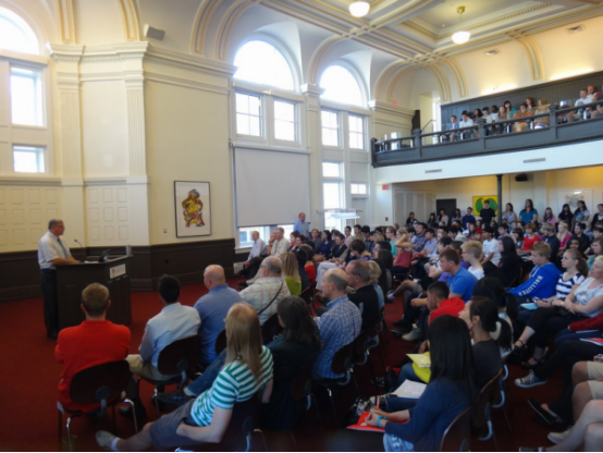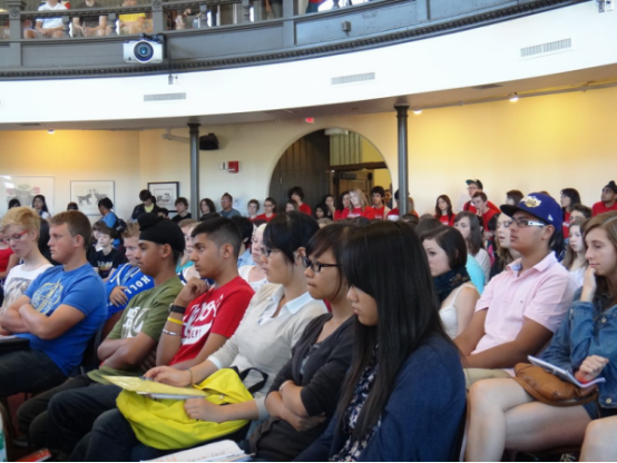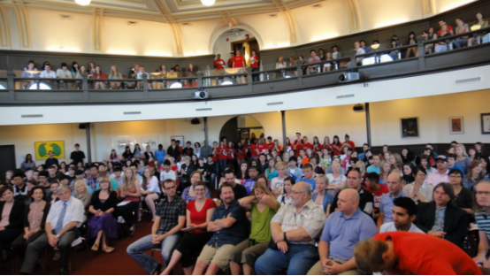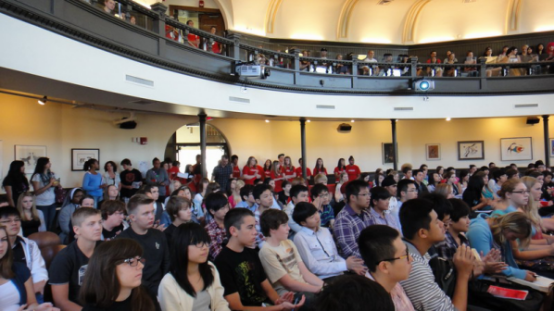 在一个类似演出大厅的会议室里,坐满了肤色迥异的学生和老师,除了我们来自明德的23名国际学生外,很少看到亚洲人的面孔,绝大部分看上去应该是本地学生。一些身穿印有“UNIVERSITY OF WINNIPEG COLLEGIATE”红色T恤衫的学生志愿者微笑着忙着引导大家入场。