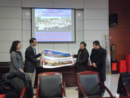 长沙市人民对外友好协会雷楚珠秘书长代表长沙市对外友协热情欢迎美国圣保罗中学师生再次来访。此次访问,是长沙市和圣保罗市结为友好城市以来,尤其是双方学校签订《友好合作意向书》以来,开展的中学教育友好交流往来活动之一。