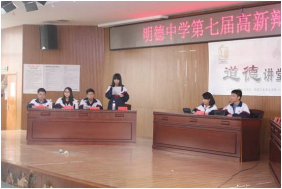 10月31日,明德中学第七届高新辩论赛班级总决赛在明德讲堂召开,经过初赛一系列紧张的角逐,国际部K342班脱颖而出,进入决赛,对手是K323班。此次辩论赛由纪委周喜兰书记,教育处黄乐主任,团委阳淼书记以及语文组夏琴老师和杨敏老师担任评委。并由季候风广播站的柳钰瑰与学生会文艺部干事金熙卓担任主持人。