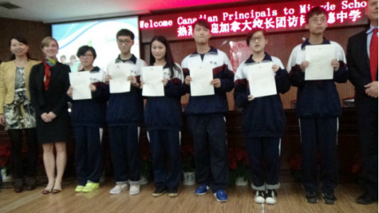 今年11月份,受迪恩福廷市长的委托,加拿大维多利亚市苏克学区国际项目部校长Laura女士及爱德华米尔恩高中的校长Patrick先生来到了明德中学,为目前就读于国际部高二的优秀学生们颁发了由维多利亚市市长签发的奖学金证书。