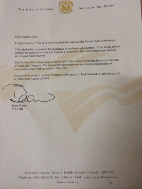 文婧婧同学获得的由维多利亚市市长签发的“维多利亚之星”奖学金证书