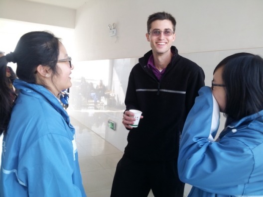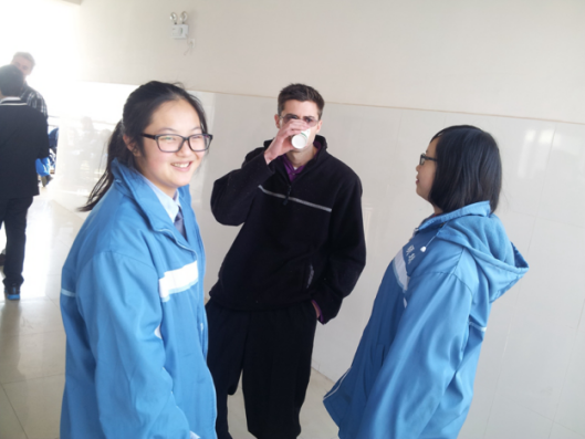在比赛开始前,同学们在候场教室里围坐在桌子周围,为了消磨时间大家一起来做传数的游戏,当然为了照顾到外教James,大家都用英文,而对于在游戏中违规的同学采取的惩罚方式是,到教室外面邀请一位外教来介绍给大家认识并做自我介绍。