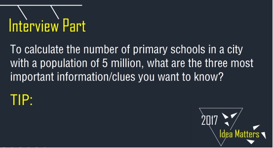 李易寰同学也给出了一个答案:1.平均家庭人口;2.平均每个家庭有多少适龄儿童;3.每个学校的学生数。(500万人口÷家庭平均人口×平均适龄儿童数=城市里有多少小学生,然后÷每所小学平均人数,得出大致有多少小学)李易寰同学的回答赢得同学一阵掌声。