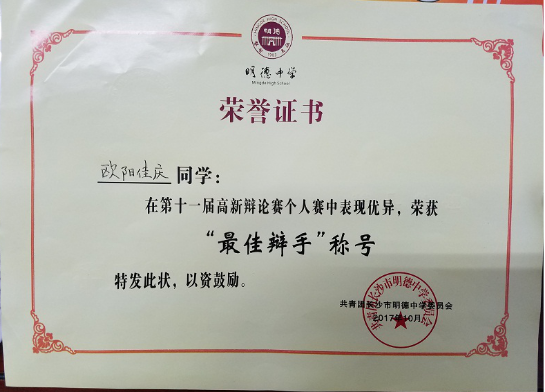 【明德国际课程中心】热烈祝贺K452欧阳佳庆荣获第十一届高新辩论赛精英赛“最佳辩手”称号