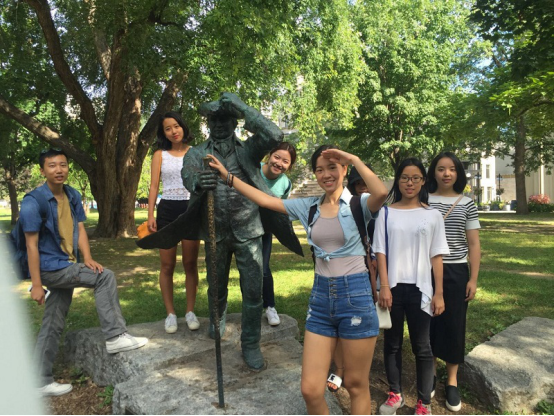 雕塑背后绿衣者为王子悦,中间者为国际部第三届学生李芊芊