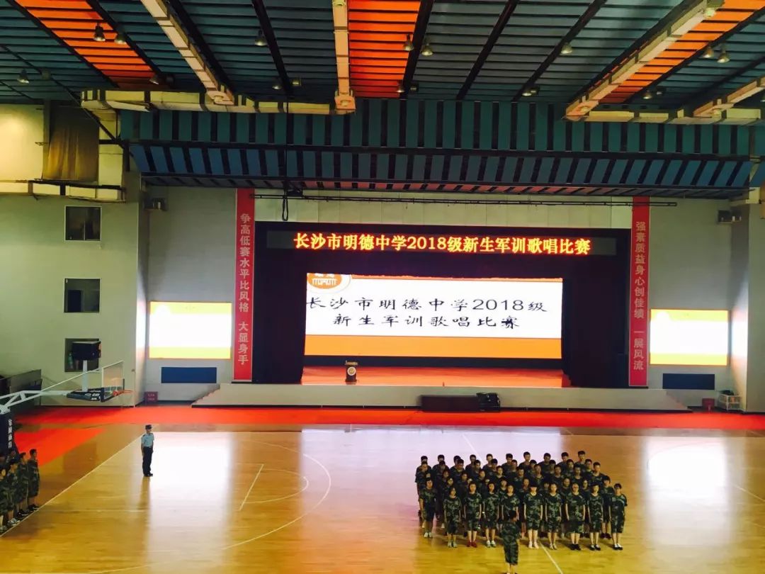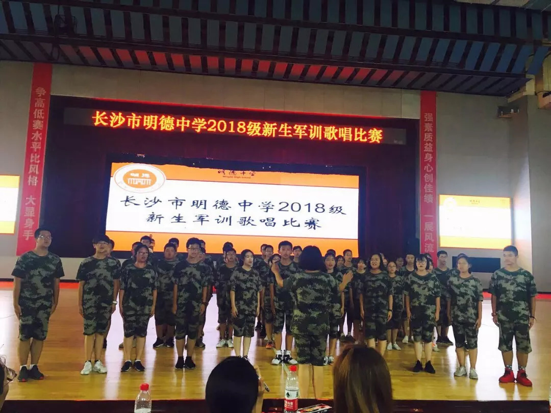 本次明德中学高一新生军训歌唱比赛以“唱响军营”为主题,给高一新生一个充分展示自我的舞台,唱出当代学生崭新的精神风貌。比赛于8月25日下午3:00在明德中学怀求体育馆举行,每个班准备2首参赛曲目--必唱校歌,自选军歌一首。明德国际部K479班与K480班组成一个连携手参赛,串烧了《在灿烂的阳光下》、《映山红》、《我们走在大路上》3首耳熟能详的军歌。