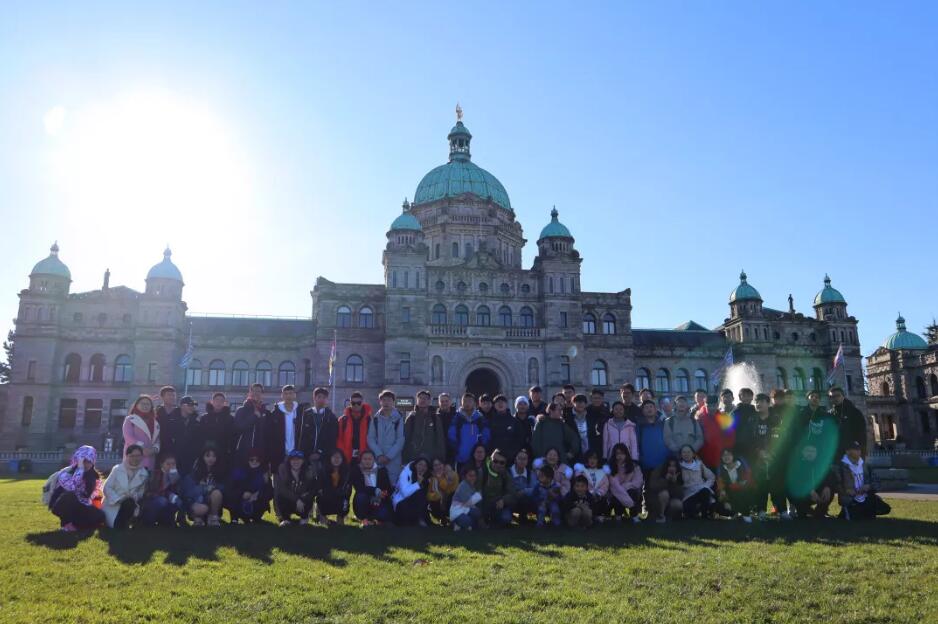 BC省议会大厦作为当地的地标,是一座维多利亚式的建筑。议会大厦外部设计宏伟气派,给人庄严肃穆的感觉,明德国际部学生在省议会大厦前留下合影。