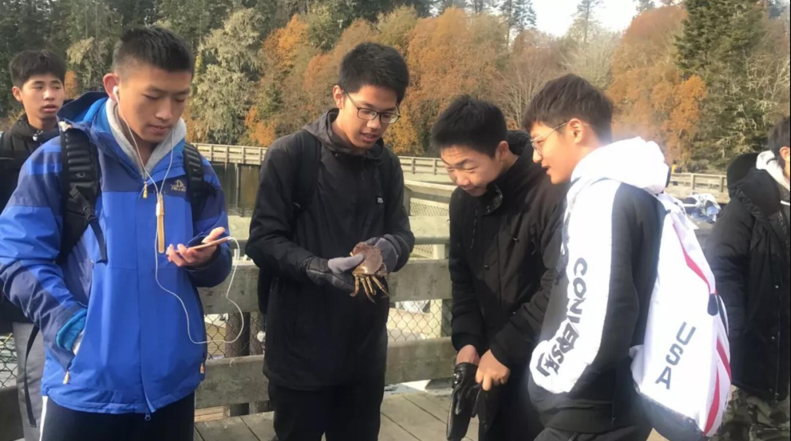 同学们除了在市区游览外,还来到了码头钓螃蟹??吹秸庑盎椤钡捏π烦扇旱谋焕躺侠?,大家都兴奋的拍手叫绝。但是加拿大对钓螃蟹有严格规定,不能捕捉母蟹,同时捕捞的螃蟹要在一定尺寸内,比如红螃蟹壳直径不得小于115毫米,灰螃蟹不得小于165毫米等,小于这个尺寸的要放生。虽然钓的螃蟹因未达到尺寸要放生,但是同学们都十分的认真的倾听着要求,这是对自然的尊重,也是宝贵的实践课。随后大家又徒步原始森林采摘蘑菇,忙的不亦乐乎。