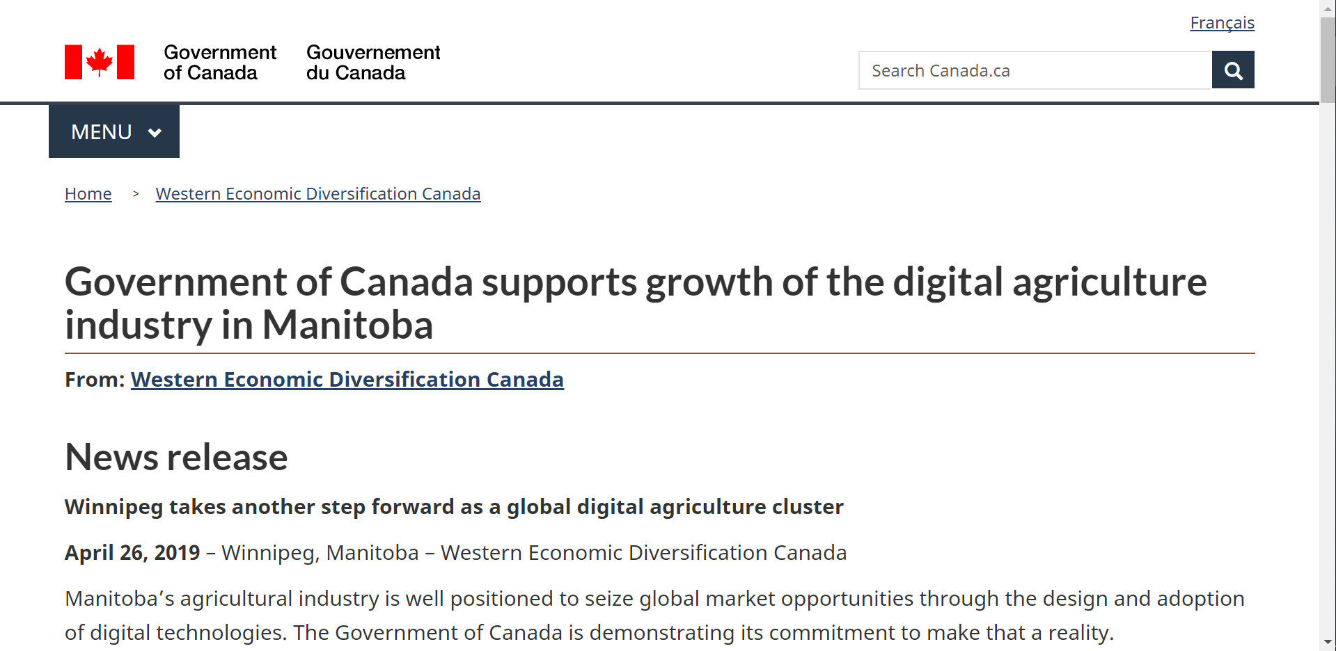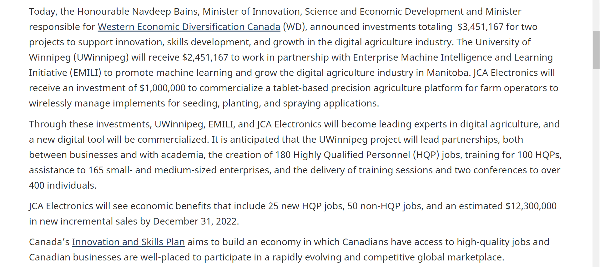 根据加拿大联邦政府4月26日的消息,创新科学和经济发展部部长兼加拿大西部经济多样化负责人Navdeep Bains宣布:温尼伯大学将获得2,451,167加币拨款,与Enterprise Machine Intelligence and Learning Initiative(EMILI)合作,以促进机器学习和发展曼尼托巴省的数字化农业产业。